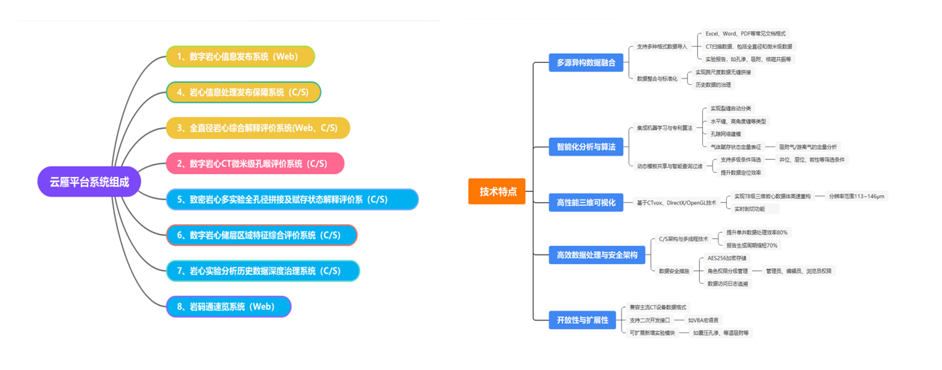 云雁CT⁺全息岩心数字化平台V3.0 ,简称云雁平台,它是以数字岩心技术为主,结合多种类基础实验分析信息,融合测井地质勘探开发数据,创建的岩心资料综合数据国内最全数字化管理平台。它由九个系统组成,形成设计采集、重构解析、聚合评价、在线发布的技术服务体系,充分解决全岩信息为核心的各项数据保存、关联、应用和挖掘,完全拥有自主知识产权技术,为智慧提质增效提供便捷服务,为勘探开发数字化转型与应用提供一站式解决方案