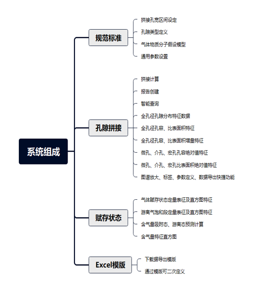 它集多种类实验数据拼接、孔隙分布分析、气体赋存状态定量表征于一体的智能化分析系统,提升效率与精度。实现岩心二氧化碳吸附、氮气吸附、高压压汞、岩心CT扫描等实验多尺度自动拼接、自动创建快速评价报告,研究微观孔隙结构从纳米到微米分布状态,计算全孔径孔隙的孔容及比表面积分布特征、气体赋存定量计算。它是由规范标准、孔隙拼接、赋存状态、区域选择、Excel模版组成。系统具有发明专利技术,多项成果发表于国内核心期刊。
